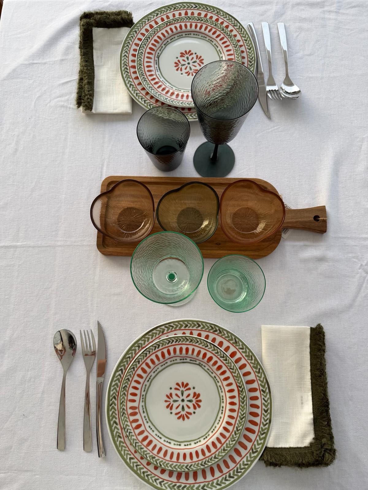 El diseño de la Servilleta puro lino Fringe presenta un refinado acabado en color blanco con flecos en tono verde bosque, aplicados alrededor de todo el perímetro. Estos flecos, elaborados en 100% lana acrílica, añaden textura y un detalle decorativo que realza la estética de la servilleta, creando una mesa cuidada y con personalidad.